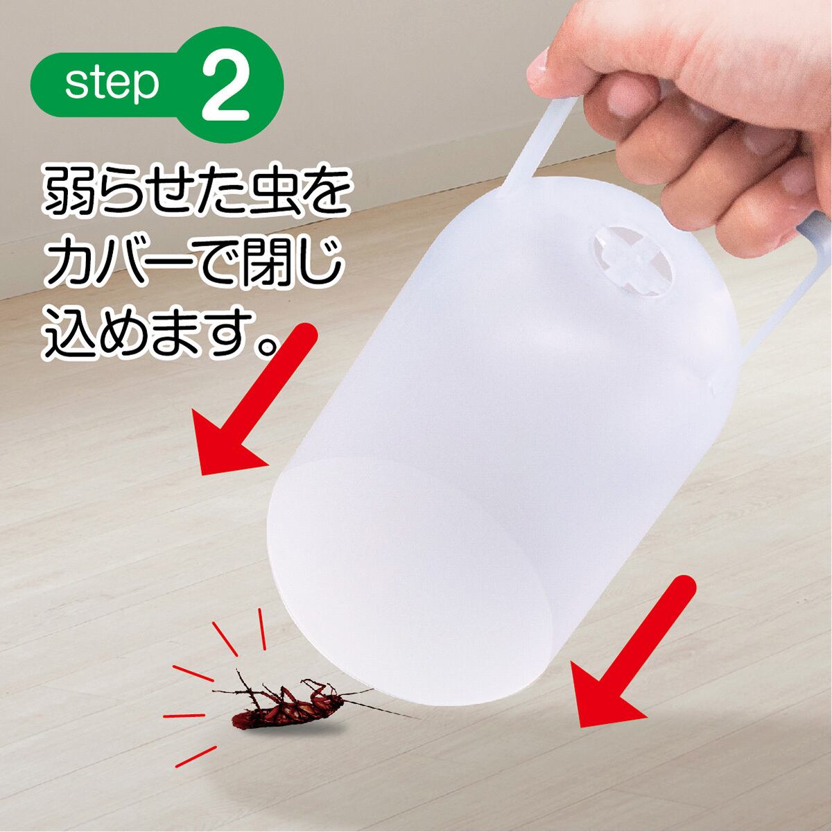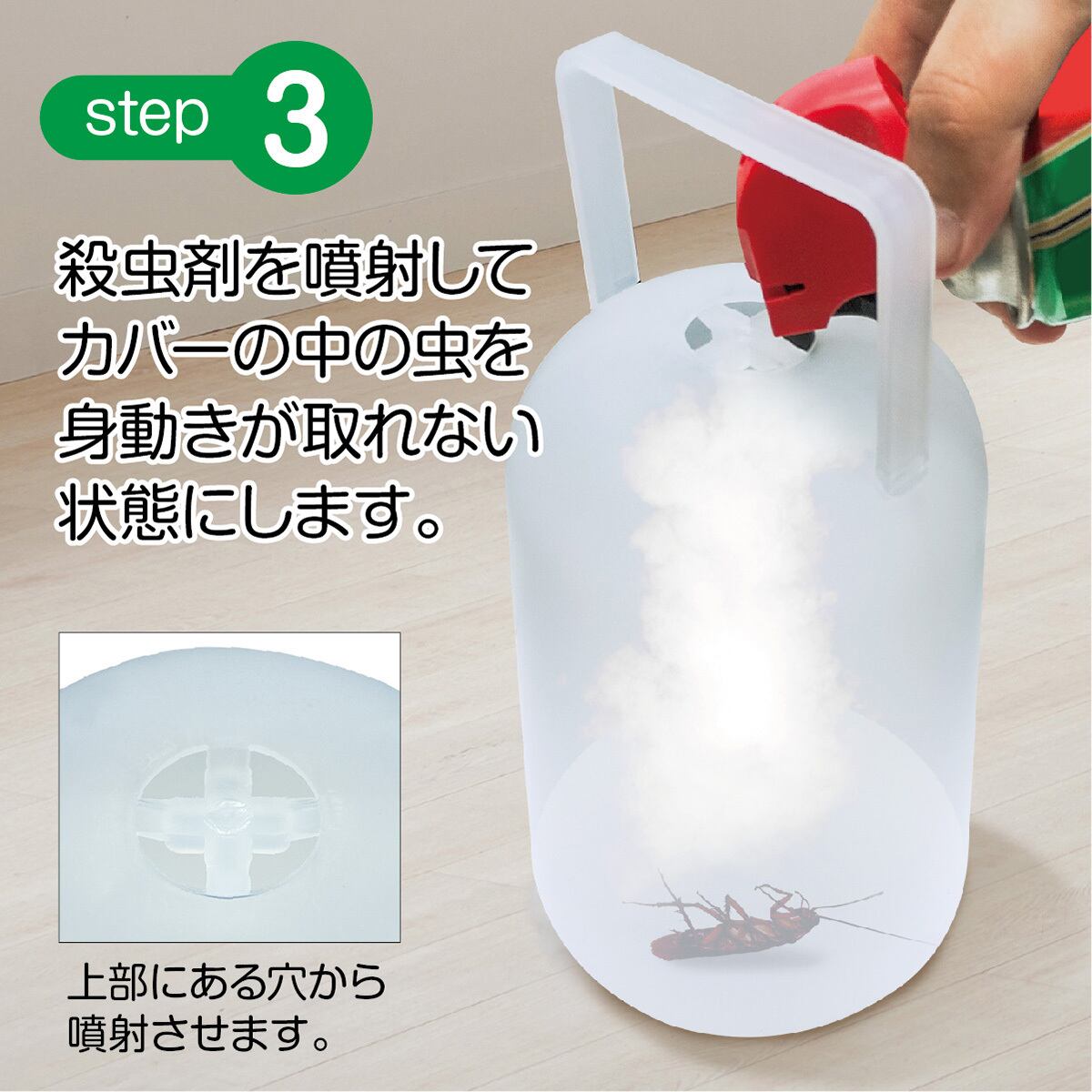 殺虫剤でゴキブリを弱らせ、カバーで閉じ込め、殺虫剤を一斉噴射して退治します。