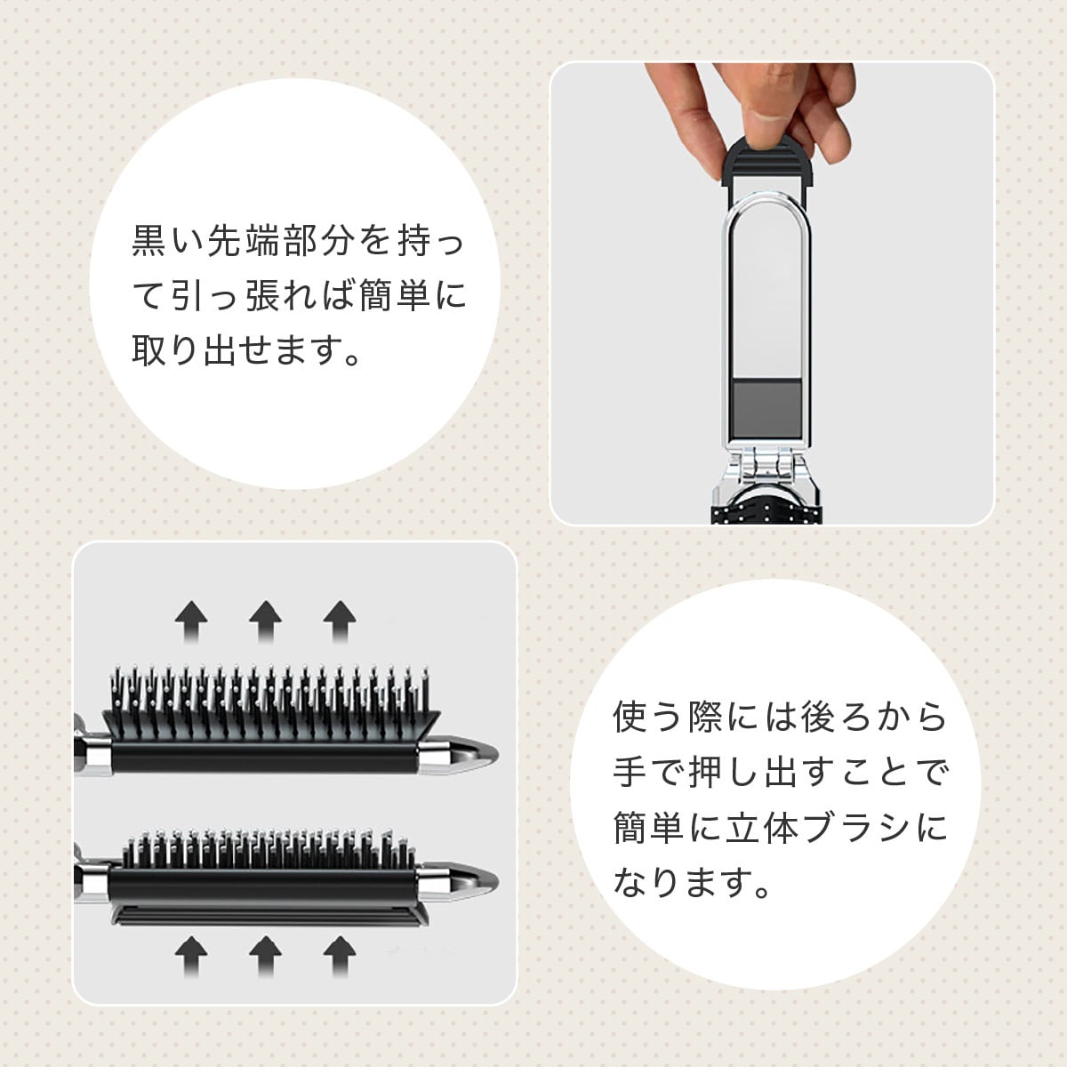 【持ち手部分には収納式のハンドミラー】鏡がない場所でもヘアブラシと一緒に使えるハンドミラーが収納されています。