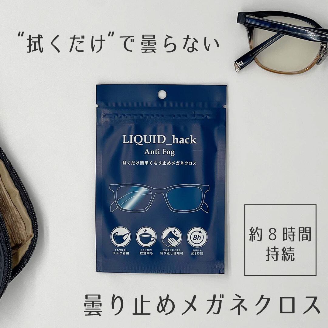 クロスに曇り止め成分、有機ポリマー・活性二酸化チタン(環境に優しい素材でできており、人体・ガラス・樹脂に害がない)を含ませて、拭くだけで曇り止め効果が約8時間持続します。